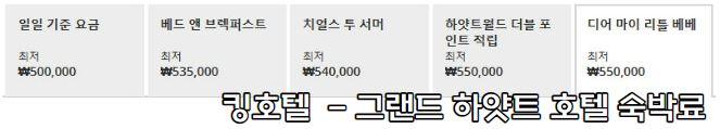 - 킹호텔 그랜드 하얏트 호텔 1박 숙박료: 50만 원 ~ 217만 5000원 (성수기 요금은 다를 수 있습니다.)
