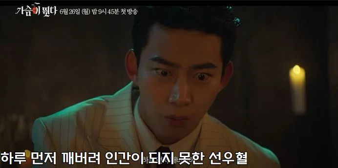 이런 웃픈 설정을 배경으로 하여 드라마 가슴이 뛴다 선우혈 뱀파이어가 백 년에서 하루 모자란 시점에 잠을 깨며 이야기는 시작됩니다.