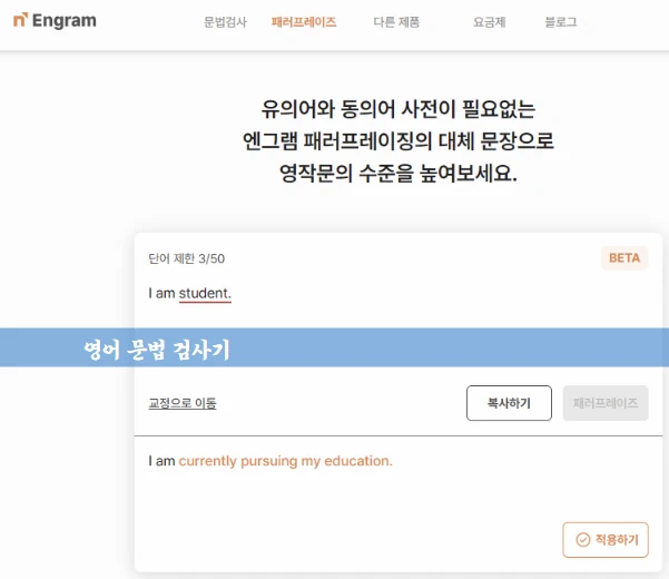 영어 문법 검사기로 실시간으로 영어문법 및 오탈자 교정을 통해 글의 정확성을 향상시킨다고 소개하고 있습니다.