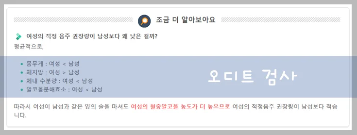 남여 차이가 있는 이유는 같은 양의 술을 마셔도 여성의 혈중알코올 농도가 더 높으므로 여성의 적정음주 권장량이 남성보다 적다고 합니다.