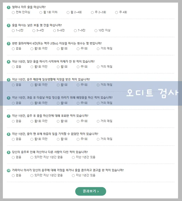 알콜 오디트 검사 문항은 위처럼 딱 10개 질문으로 구성되어 있습니다. 간단한 문항으로 금새 결과보기를 통해 점수를 확인할 수 있습니다.