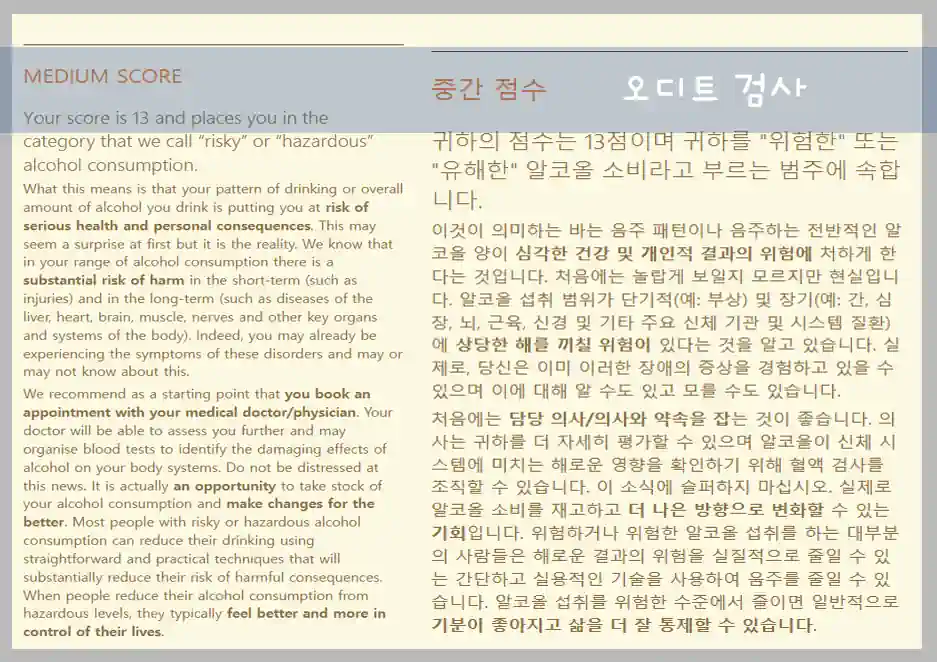 외국의 알코올 오디트 검사에서는 중독치료 필요여부 같은 친절한 추가 검사는 없습니다.