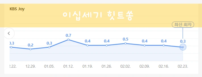 이십세기 힛트송 시청률은 0.4%에서 왔다갔다 하고 있습니다. 1월 12일에는 김민아 하차 이슈였는지 시청률이 갑작스레 뛰기도 했습니다.