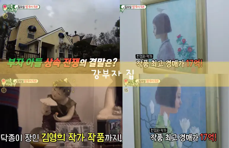 미우새에서 공개한 별장에 있는 재산만 해도 이미 연금 지급 상한선을 넘었습니다. 당시 기준 재산은 18억 5000만 원으로 정해져 있었습니다. 최근 별장에서 공개된 천경자 작가 작품 최고 경매가가 17억으로 알려져 있습니다. 그런 작품이, 작품들이 가득하니 당연히 강부자 재산 기준이 넘습니다.