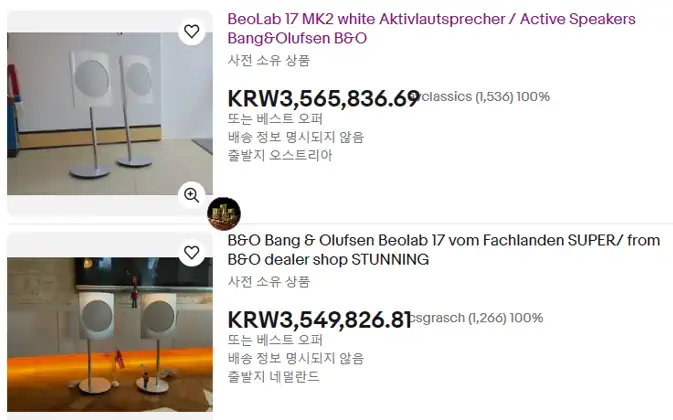 세팅된 홈시어터 스피커 Bang & Olufsen Beolab 17 제품으로 580만 원으로 네이버 최저가로 올라와있으나 이베이에 350만 원대로 올라와 있습니다.